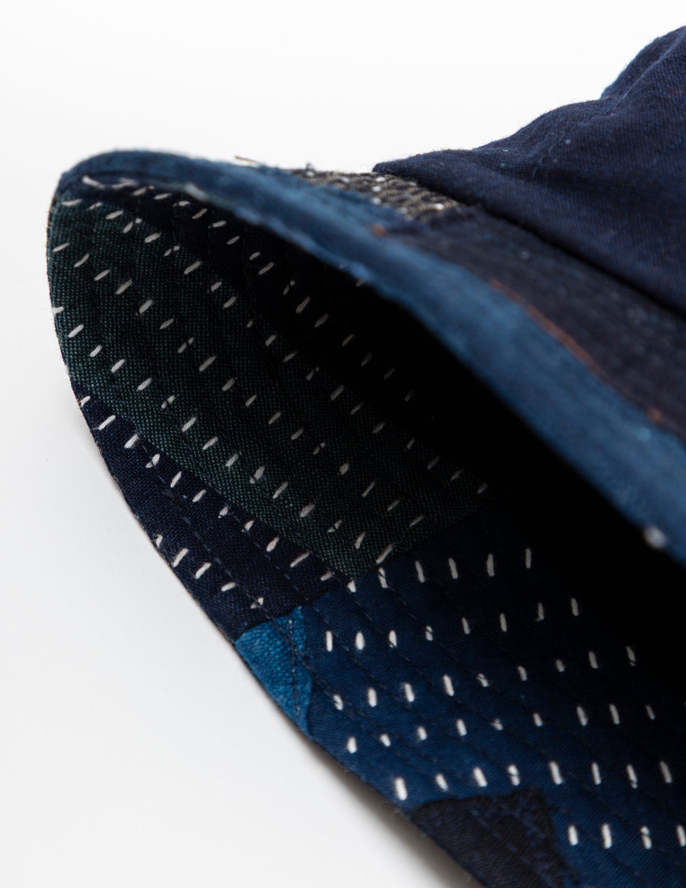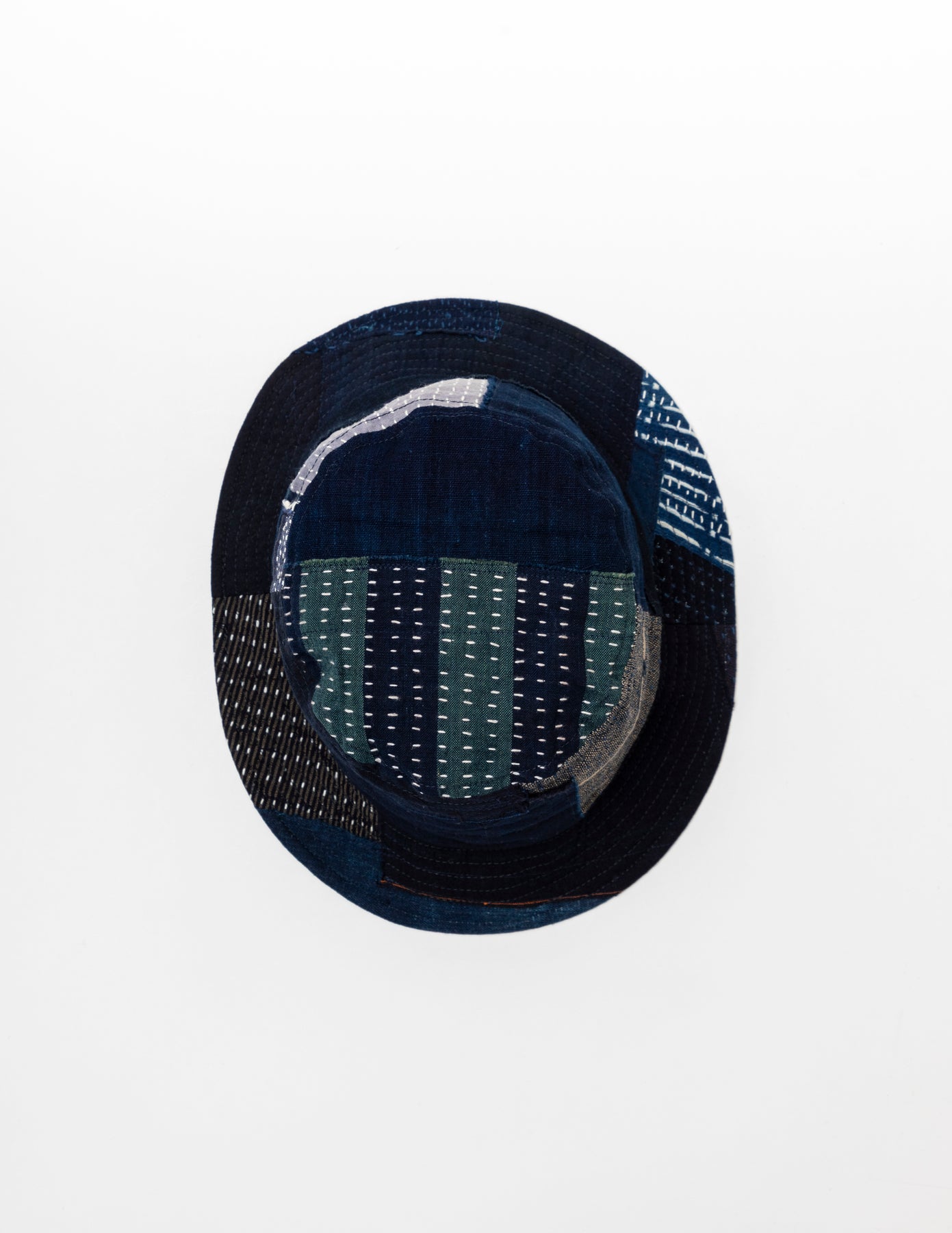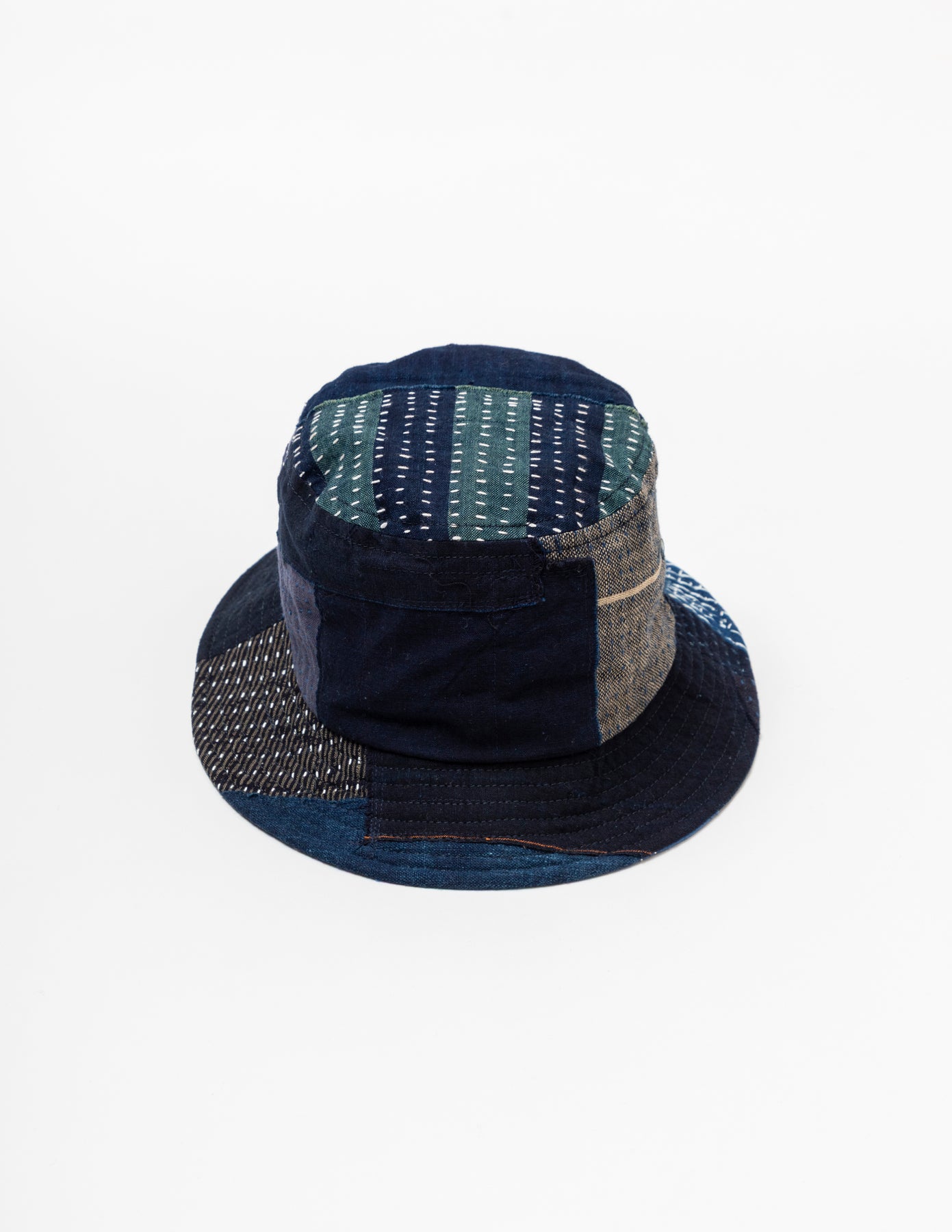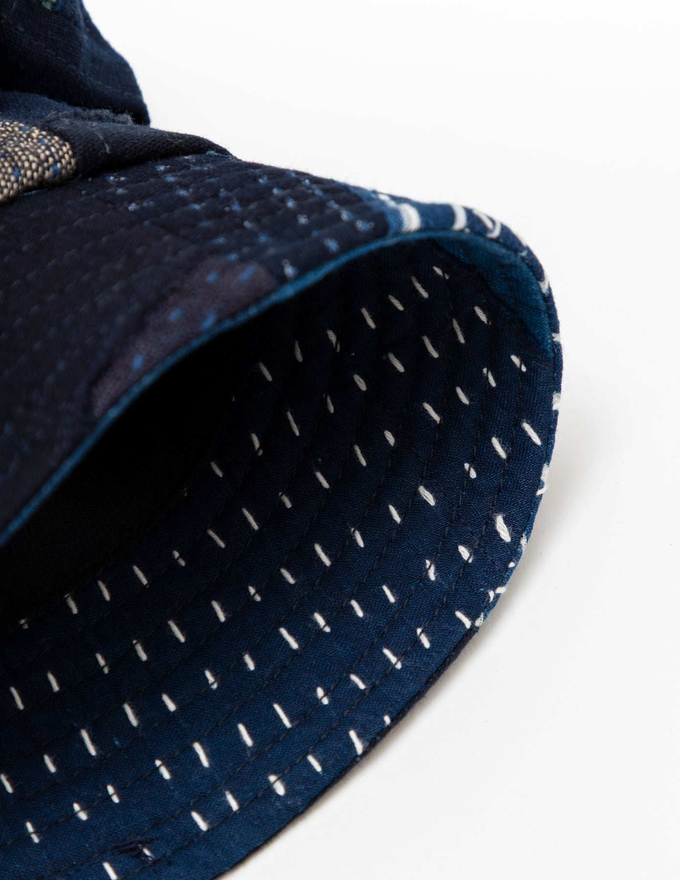藍染めの古布「BORO」の端切れに刺し子を施し、それぞれの布を補い合うようにランダムなパッチワークで仕上げたバケットハットです。