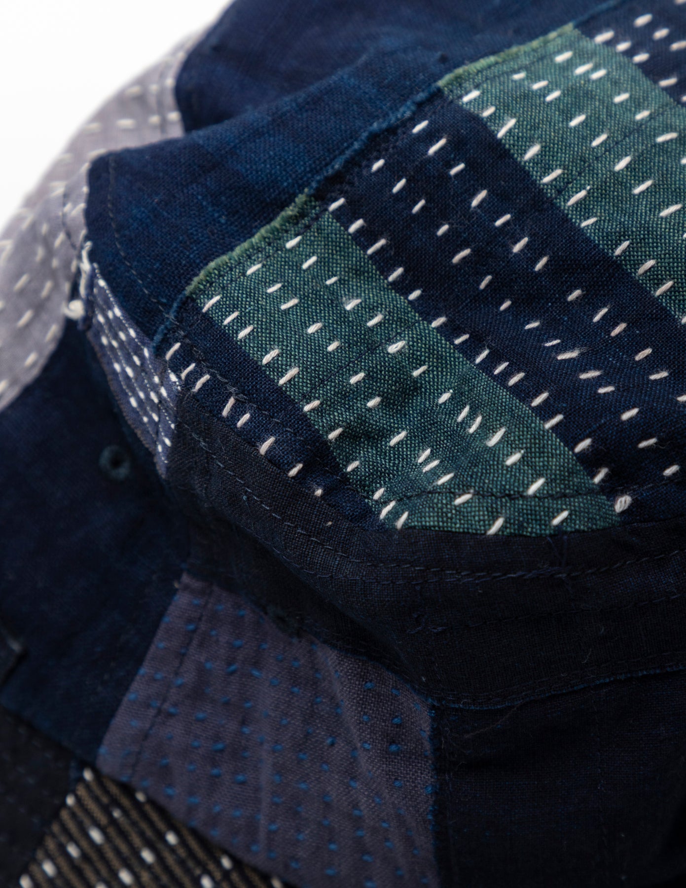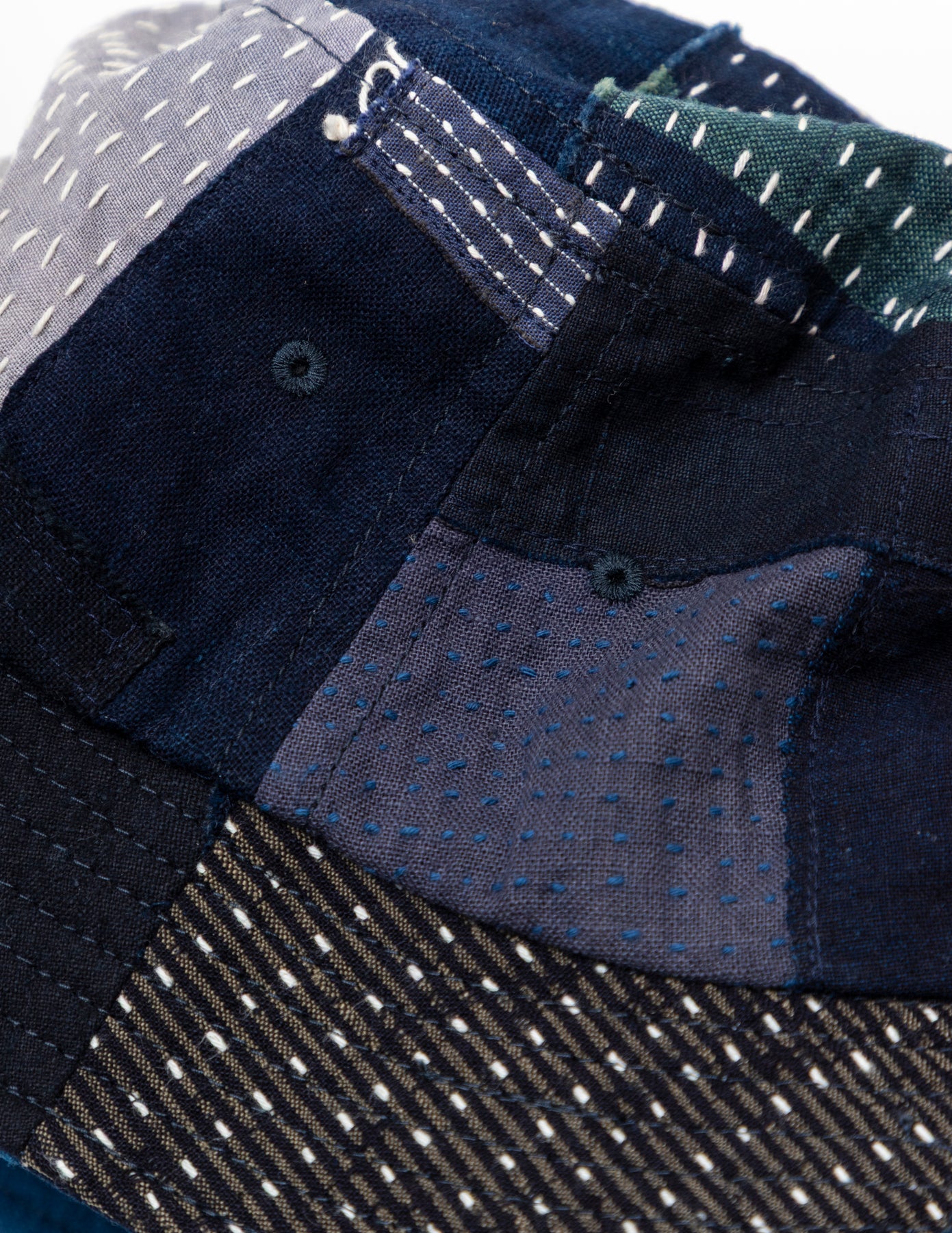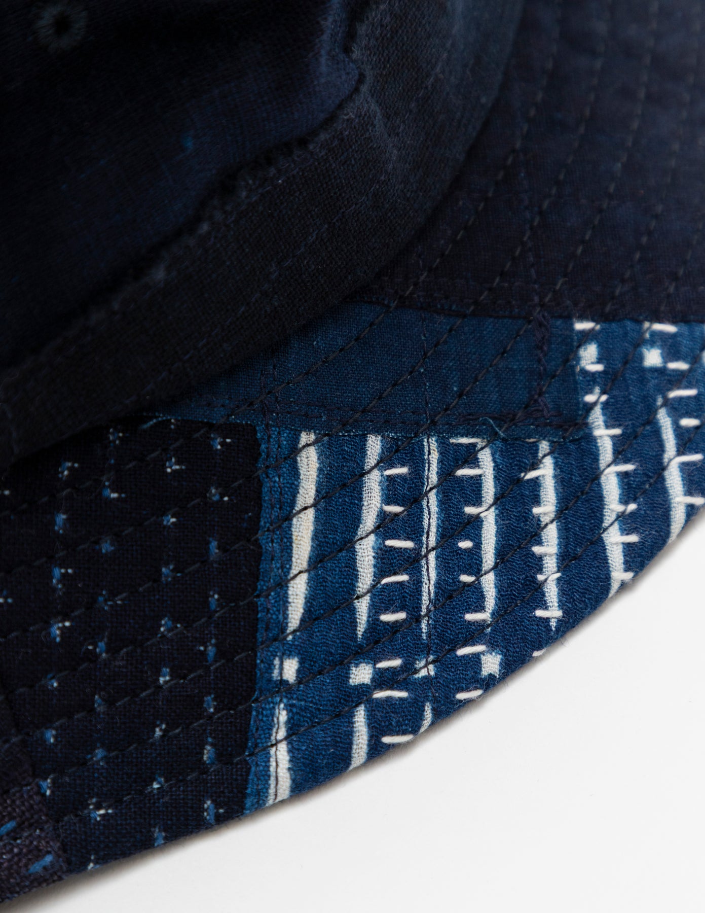 藍染めの古布「BORO」の端切れに刺し子を施し、それぞれの布を補い合うようにランダムなパッチワークで仕上げたバケットハットです。