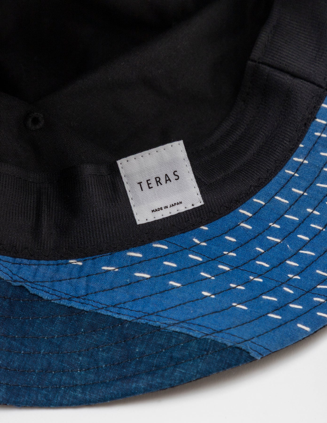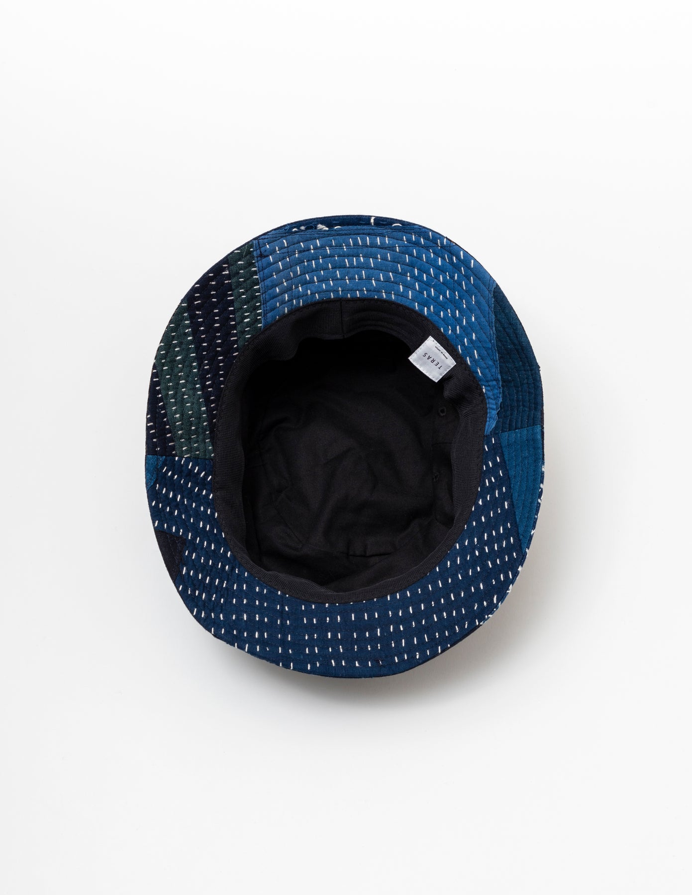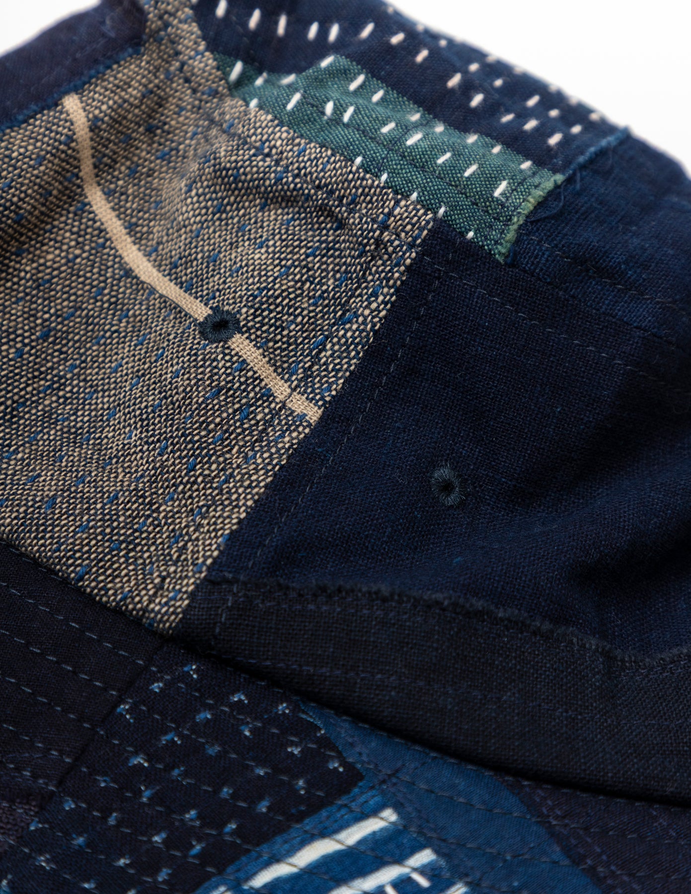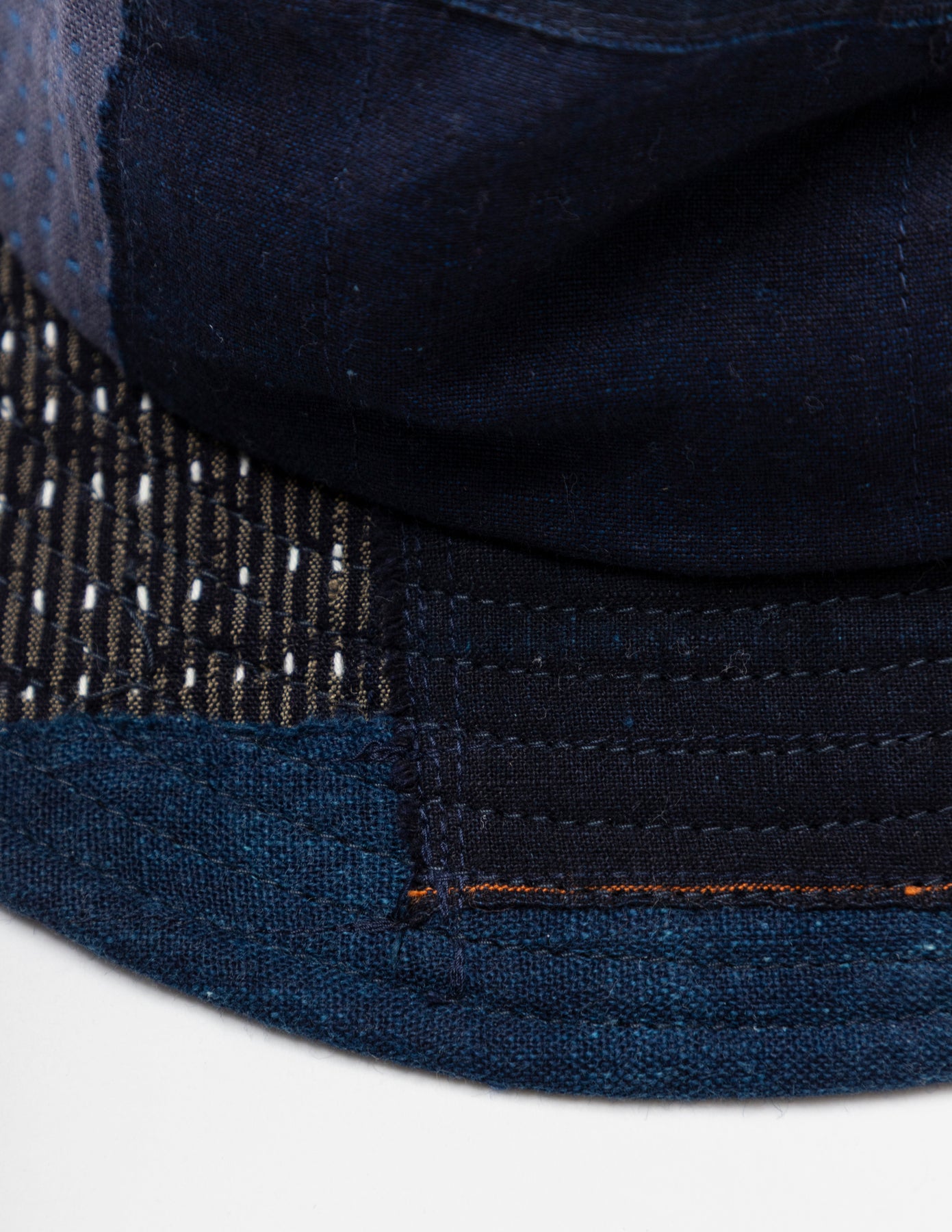 藍染めの古布「BORO」の端切れに刺し子を施し、それぞれの布を補い合うようにランダムなパッチワークで仕上げたバケットハットです。